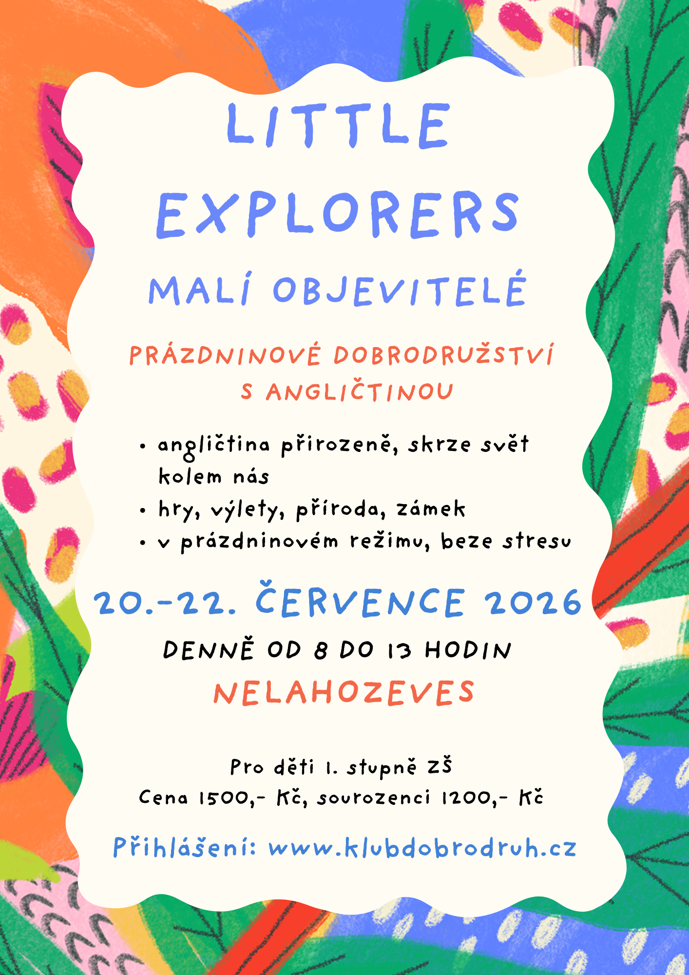 Prázdninové dobrodružství v Nelahozevsi, kde děti přirozeně objevují angličtinu při hrách, tvoření i výletech. Učí se slovíčka a fráze v reálných situacích – v klubovně, v přírodě i na zámku, bez stresu a školní atmosféry. Program je určen pro děti 1. stupně ZŠ, které chtějí angličtinu zažít jinak než ve škole.